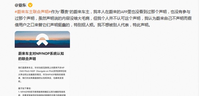 对于蔚来车主的这个声明,各位易友怎么看?至少我们看到了不同的声音,这还是一件好事。而对于本次事件的结论,我们也会继续关注事件的进度。