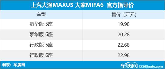 新款上汽大通大家MIFA6上市 售19.98万起