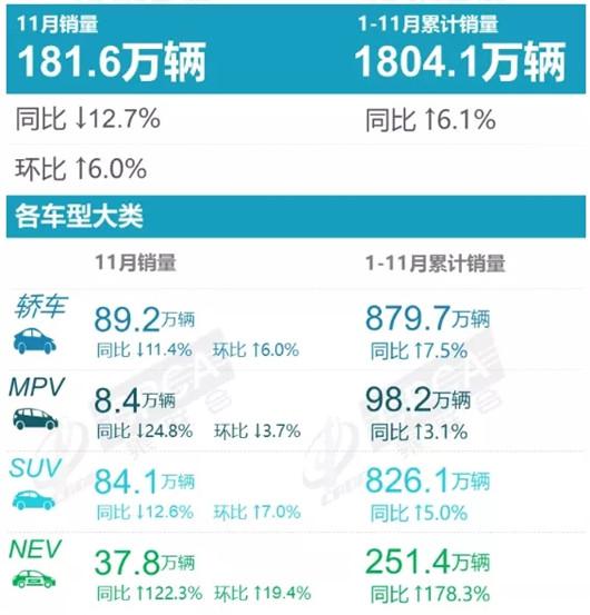 在长达半年的负增长之后,今年前11个月的累计同比增幅也收窄至6.1%,并且由于去年12月的销量高达228.9万辆,是以12月车市还将继续走跌,这也意味着今年全年的增幅将只收于5%左右。