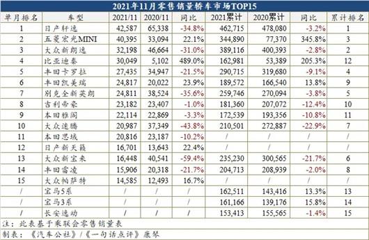 11月车型销量榜:轩逸重返第一!