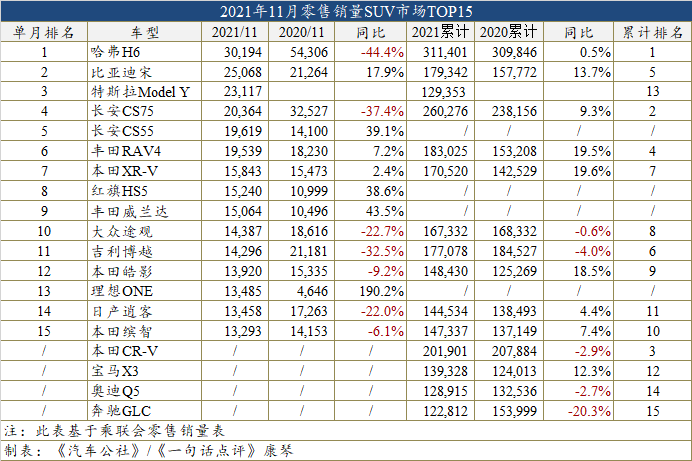 而11月来自长安的CS75虽因不敌Model Y被挤至第4,但依仗着26.0万辆总销量,它绝对能守住SUV年度亚军之位。