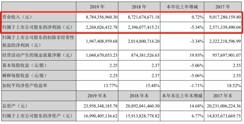 威孚高科(000581)2019年财报显示,该年度公司实现营业总收入87.84亿元,同比增长0.72%;实现归母净利润22.68亿元,同比下降5.34%,降幅较去年同期收窄;每股收益为2.25元。该年度公司毛利率为24.1%,同比提高0.8个百分点,净利率为26.2%,同比降低2.1个百分点。