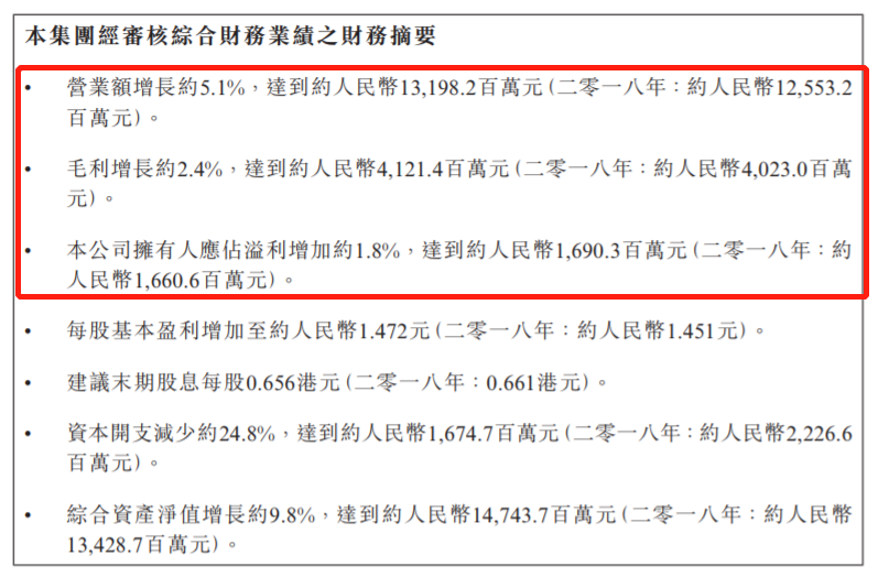 敏实集团(00425)2019年度业绩公告显示,年内公司实现营业额增长约5.1%,达到约131.98亿元;毛利增长约2.4%,达到约41.21亿元;公司拥有人应占溢利增加约1.8%,达到约16.9亿元。
