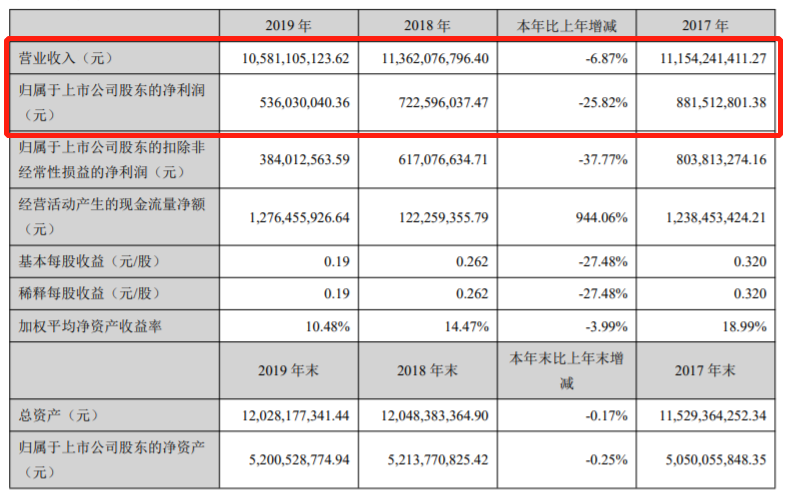据万向钱潮(000559)2019年年报,该年度公司实现营业总收入105.81亿元,同比下滑6.87%;实现归母净利润5.36亿元,同比下降25.82%;每股收益为0.19元。该年度公司毛利率为17.6%,同比下滑1.0个百分点,净利率为5.2%,同比下滑1.4个百分点。