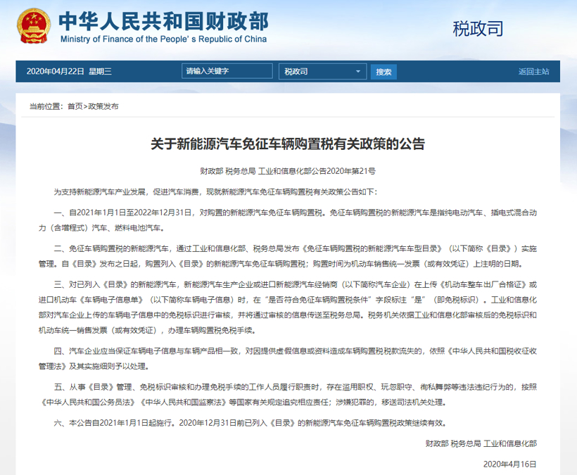 财政部等三部委:2021至2022年对新能源汽车免征车辆购置税