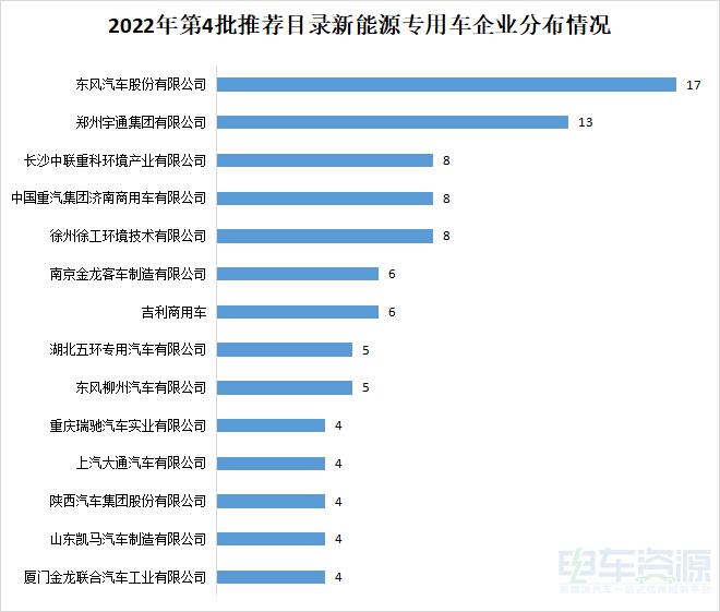 从企业来看,东风汽车获得推荐的车型数量最多,有17款。其次是宇通集团,13款车获得推荐。中联环境、中国重汽、徐工环境均有8款车进入目录,并列第三位。南京金龙、吉利商用车均有6款产品获得推荐,湖北五环专用汽车有限公司、东风柳州汽车有限公司各有5款车型进入本批次推荐目录。