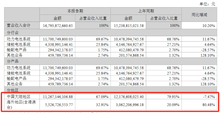 举例来说,国轩高科上半年海外地区营收同比增长80.48%,达到55.27亿元,较去年同期绝对值增加24.65亿元,海外收入比重从20.34%提升至32.91%,且海外地区毛利率达到21.12%,远高于中国大陆地区16.18%的毛利率水平。