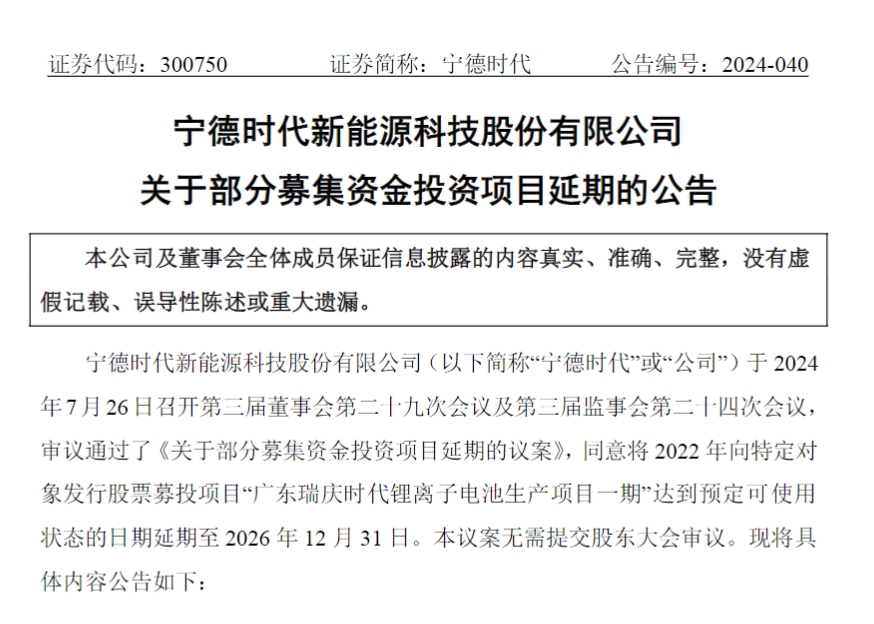 另外智驾网格注意到,7月26日晚,宁德时代公告将2022年定增募投项目“广东瑞庆时代锂离子电池生产项目一期”达到预定可使用状态的日期由原来的2024年6月1日大幅延期两年半,至2026年12月31日。